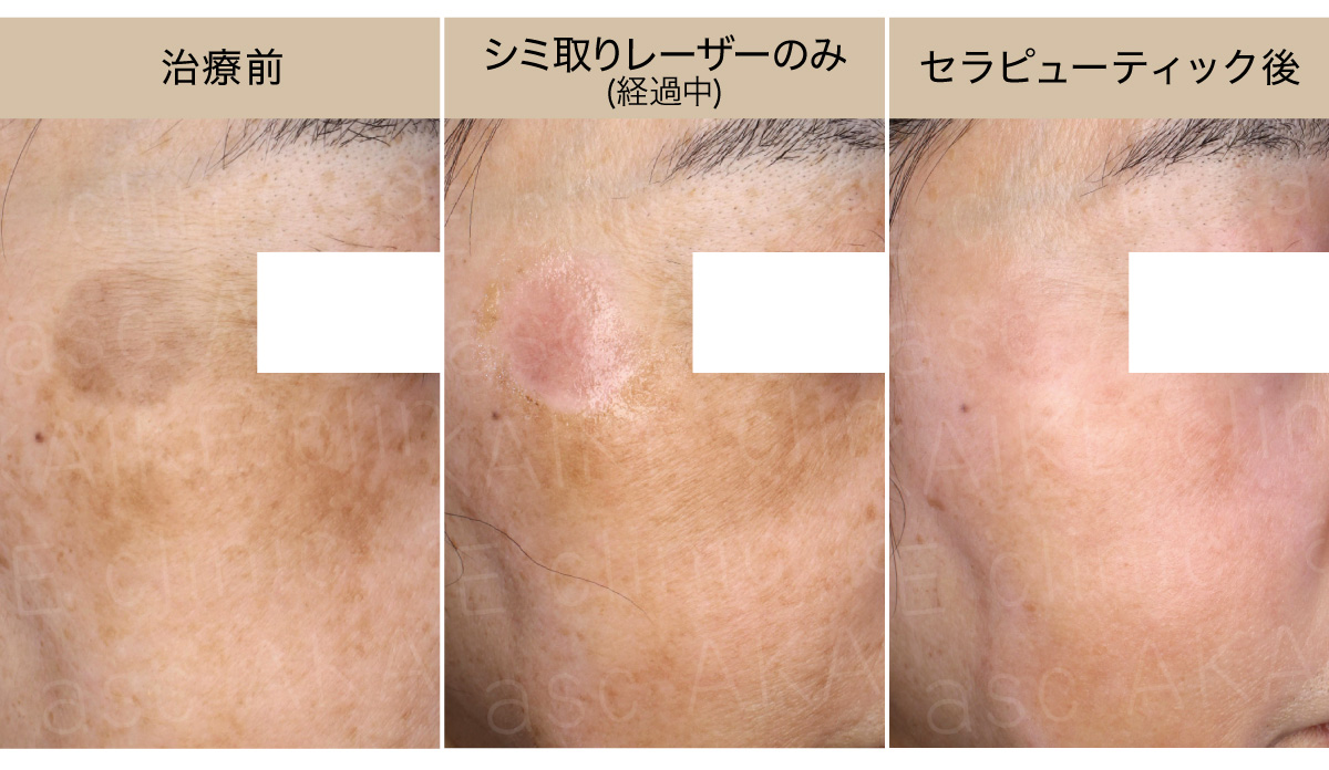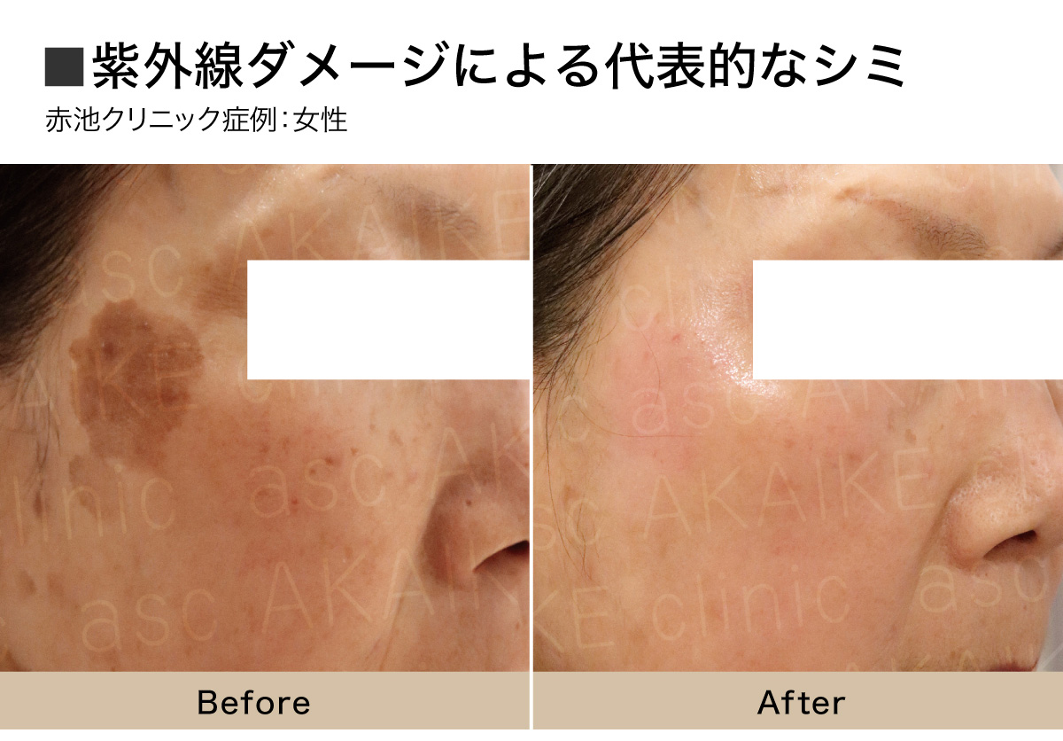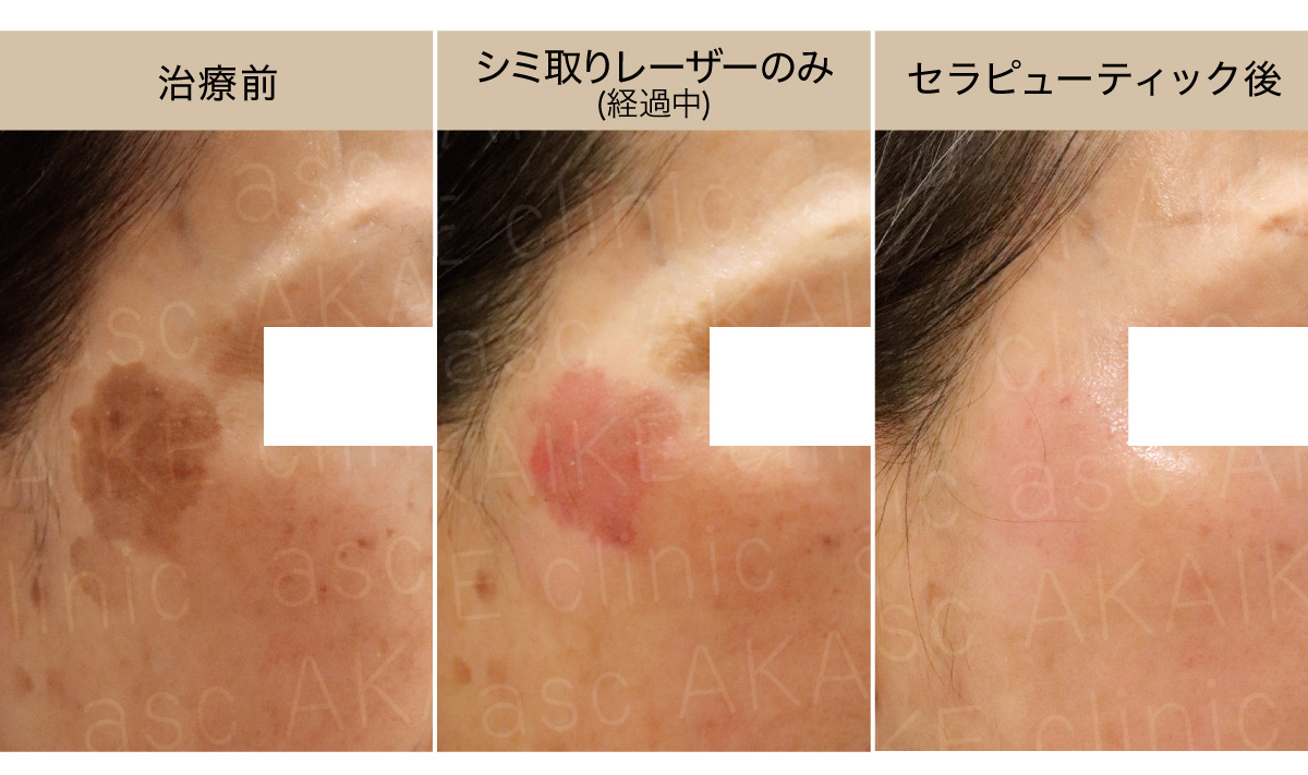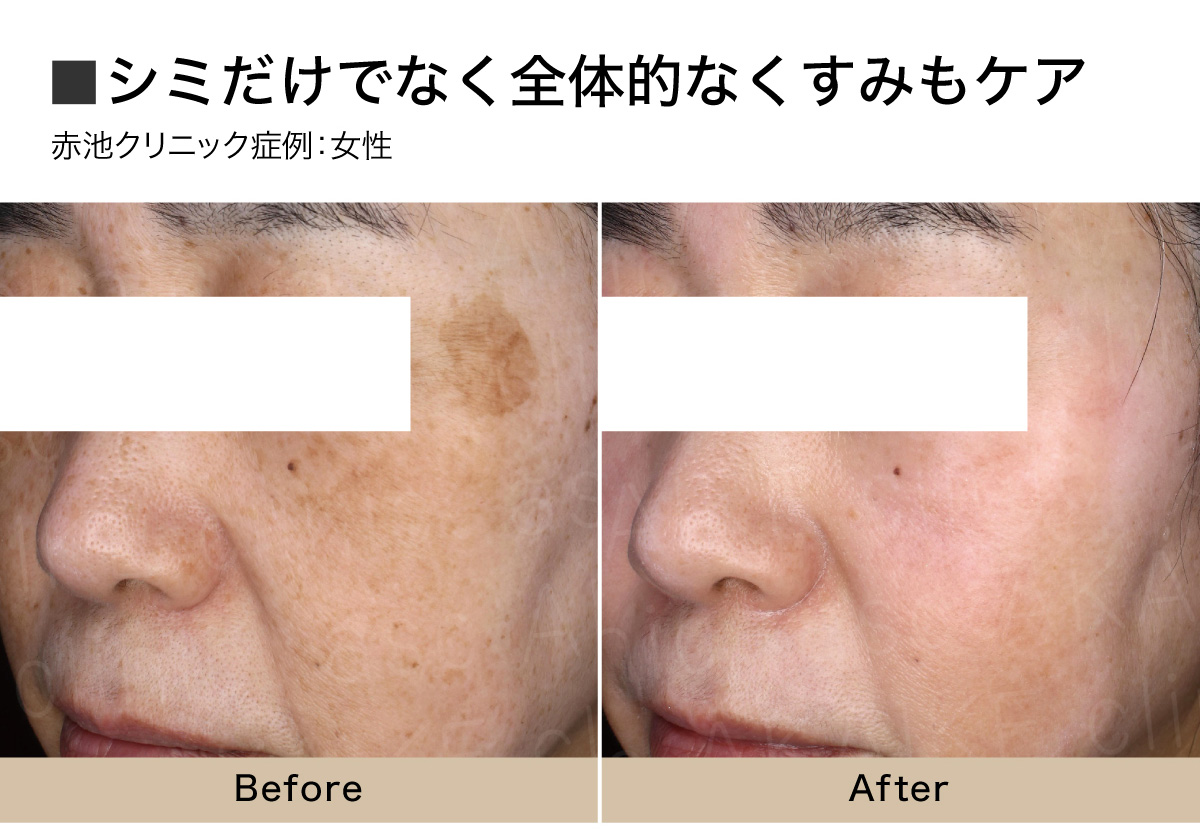 複数のシミ(ソバカス、普通のシミ、肝斑)が混在していましたが、シミの種類に合わせたレーザー治療で改善しました。レーザー治療後にビタミンA治療を行うことで、ハリやツヤ、小じわや全体の色ムラが改善しています。