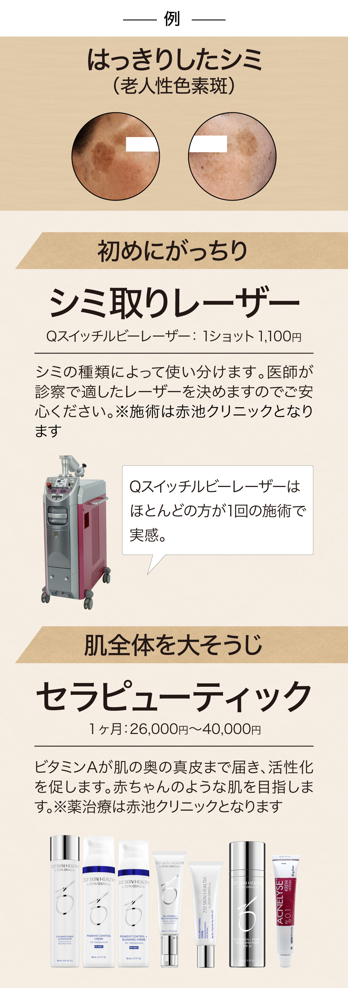 【治療内容と料金】メドライトC6(トライアル18,000円、2回目以降30,000円)、Qスイッチルビーレーザー(1,100円/1ショット)、ゼオスキンヘルス・セラピューティック(1ヶ月26,000~40,000円)、エンビロントリートメント(1回 8,800~13,200円)